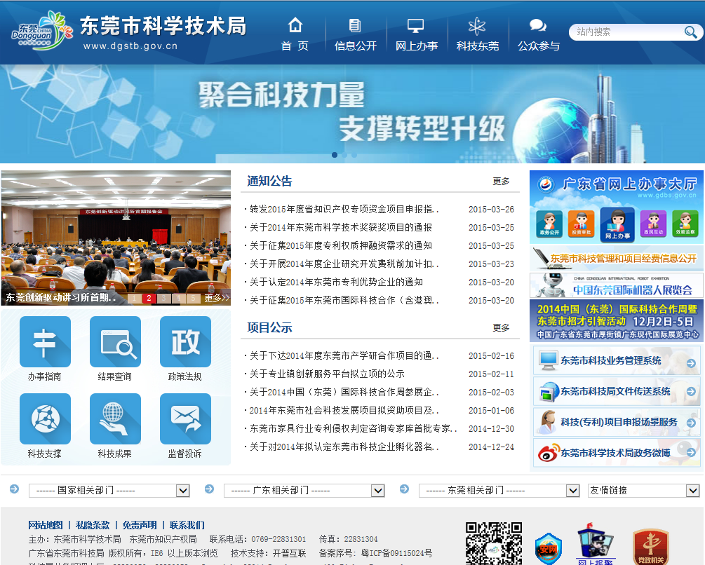 目前,东莞市科学技术局新浪政务微博共有粉丝2600多个,2014年共发布微博信息295条。东莞市知识产权维权援助中心微信平台设有举报投诉、维权咨询、法律法规、办事指引等栏目,并及时发布我市知识产权工作的最新动态。12月底开通了东莞市科学技术局官方公众微信平台,通过微信公众平台等移动端方式向群众主动推送公开信息。